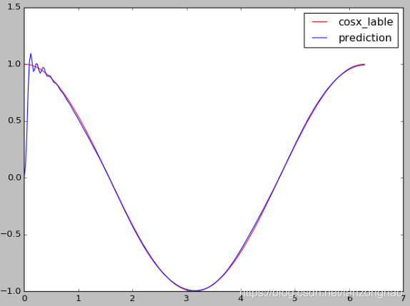 def eval():model.eval()start, end =0 * np.pi, (0+2) * np.pisteps = np.linspace(start, end, Times_step, dtype=np.float32)sin_x = np.sin(steps)print('sin_x:', sin_x)cos_x = np.cos(steps)# print('sin_x.shape',sin_x.shape)# batch,sequence,input_size (1,256,1)sinx_input = torch.from_numpy(sin_x[np.newaxis, :, np.newaxis])model.load_state_dict(torch.load('model_params.pth',map_location='cpu'))with torch.no_grad():y_pre=model(sinx_input)# print('sinx_input.shape:',sinx_input.shape)cosx_lable = torch.from_numpy(cos_x[np.newaxis, :, np.newaxis])plt.plot(steps, cosx_lable.data.numpy().flatten(), color='r',label='cosx_lable')plt.plot(steps, y_pre.data.numpy().flatten(), color='b',label='prediction')plt.legend(loc='best')plt.show()