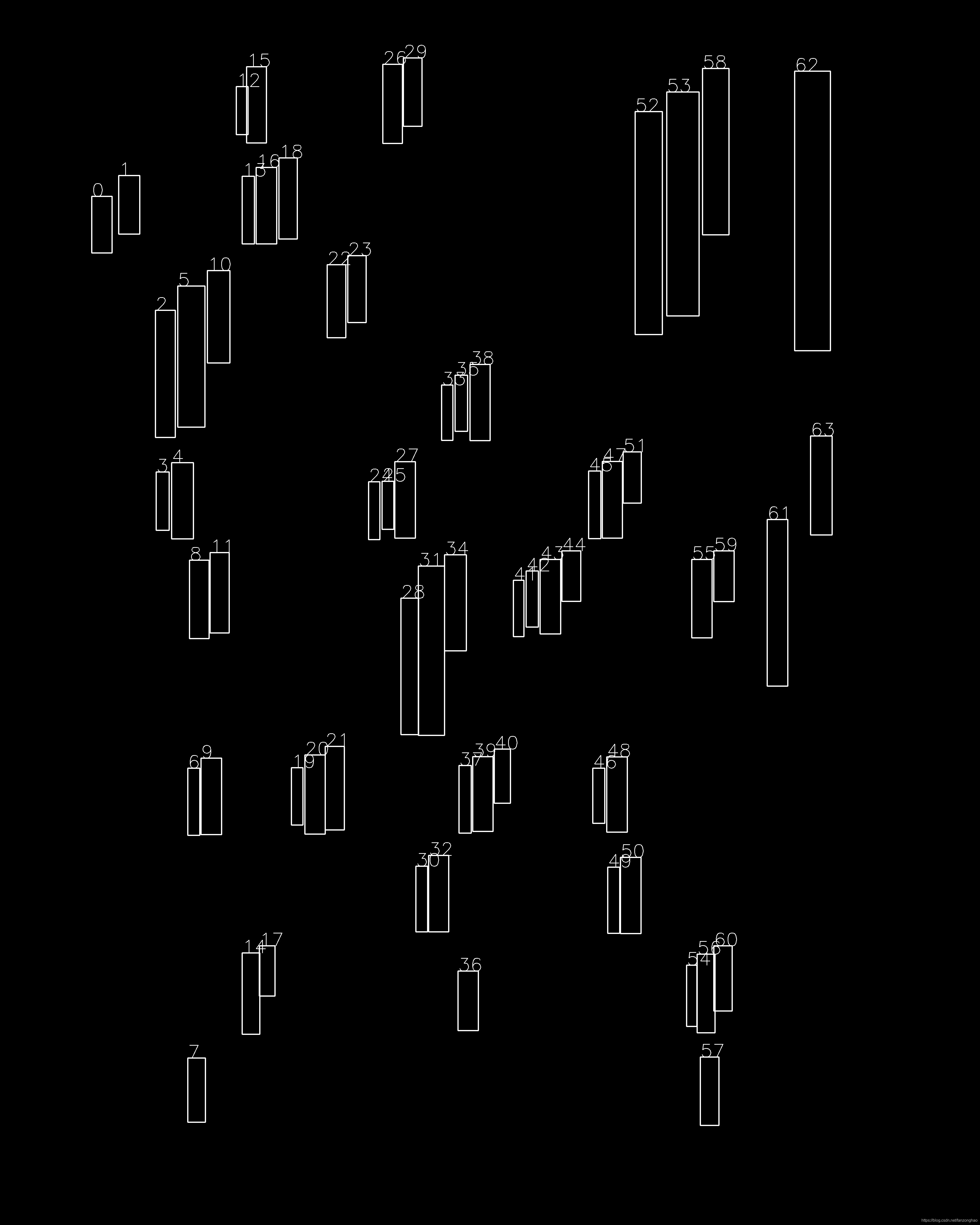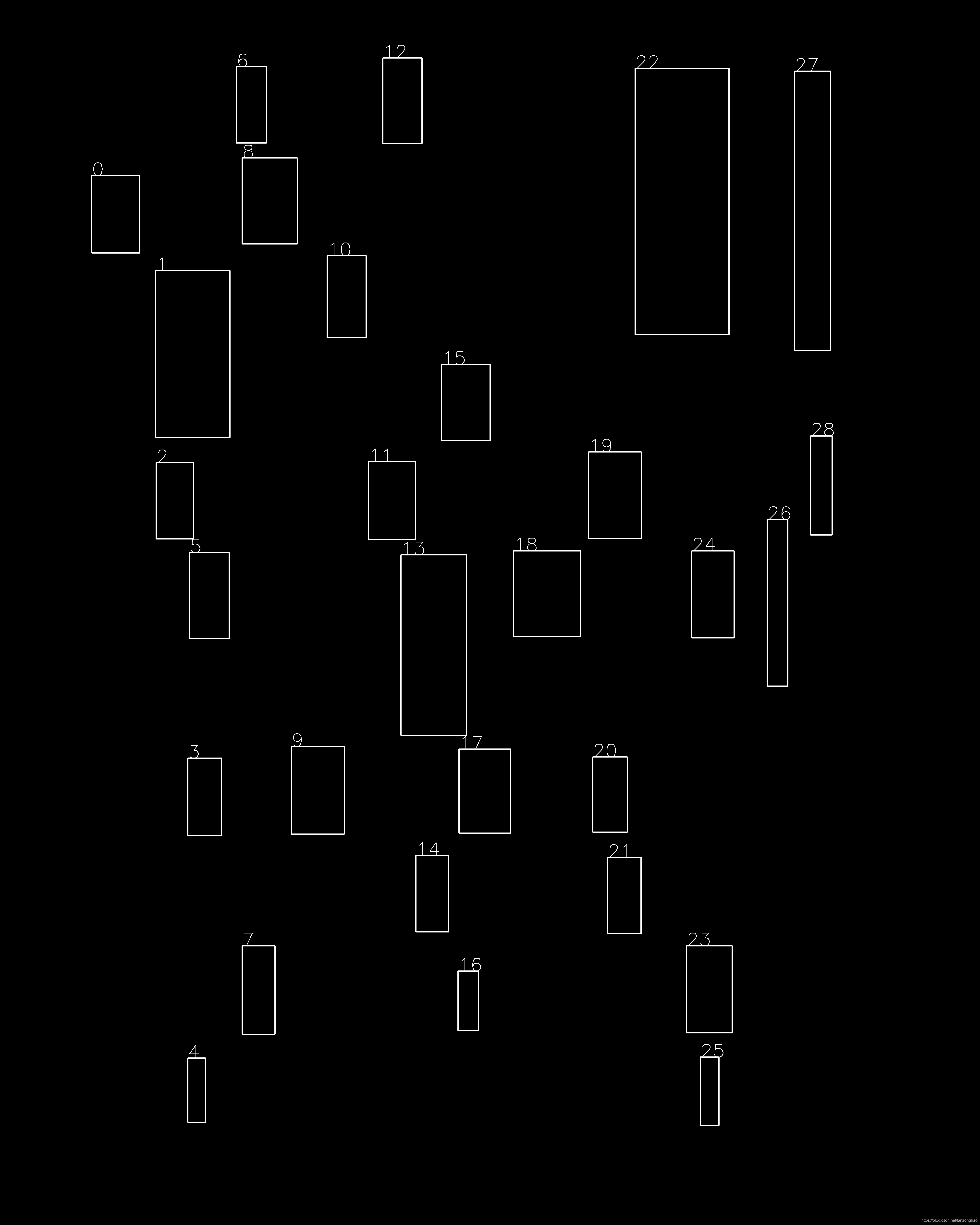 def fix_bbox_point(cluster):points=[]for i,evry_cluster in enumerate(cluster):every_cluster = np.array(cluster[i]).reshape(-1, 4)x1,y1,x2,y2=np.min(every_cluster[:,0]),np.min(every_cluster[:,1])\,np.max(every_cluster[:,-2]),np.max(every_cluster[:,-1])points.append([x1,y1,x2,y2])return np.array(points)def union_bboxs(points):cluster_first = get_cluster(points, x_dis=50, y1_dis=300)# print('===cluster=====')# print(len(cluster_first))first_bboxs = fix_bbox_point(cluster_first)cluster_second = get_cluster(first_bboxs, x_dis=50, y1_dis=300)# print('===cluster=====')# print(len(cluster_second))second_bboxs = fix_bbox_point(cluster_second)cluster_third = get_cluster(second_bboxs, x_dis=50, y1_dis=400)# print('===cluster=====')# print(len(cluster_third))third_bboxs = fix_bbox_point(cluster_third)return third_bboxsif __name__ == '__main__':# points = np.array([[1264, 1480, 1346, 1790],# [2278, 1873, 2380, 2542],# [3209, 2279, 3286, 2599],# [2195, 3468, 2277, 3772],# [844, 1087, 924, 1399],# [92, 876, 181, 1327],# [951, 306, 1033, 596],# [1652, 299, 1729, 604],# [2196, 1957, 2270, 2535],# [916, 4251, 994, 4563],# [1131, 1915, 1214, 2505],# [1042, 265, 1116, 532],# [2124, 2036, 2195, 2603],# [934, 1054, 1003, 1258],# [1522, 3561, 1585, 4086],# [999, 4220, 1068, 4422],# [2404, 586, 2516, 1209],# [1452, 3618, 1528, 4151],# [1354, 1449, 1425, 1655],# [1583, 3532, 1683, 4109],# [1207, 1525, 1256, 1792],# [2144, 3511, 2191, 3779],# [3162, 2319, 3205, 2549],# [787, 1124, 837, 1395],# [896, 339, 944, 606],# [1741, 260, 1813, 467],# [219, 3230, 330, 3785],# [1424, 2675, 1506, 2818],# [2528, 538, 2714, 1709],# [2287, 664, 2394, 1596],# [231, 1703, 428, 2598],# [287, 248, 473, 1638],# [186, 280, 265, 1025],# [1670, 3480, 1756, 3852],# [1754, 2277, 1836, 2431],# [3284, 2241, 3360, 2455],# [2823, 1662, 3163, 1730],# [2897, 2852, 3285, 2946],# [2972, 2700, 3049, 2790]])points=np.array([[700,1888, 789, 2199],[1918, 1487, 2000, 1798],[1045, 683, 1129, 995],[2867, 279, 2975, 958],[1929, 3088, 2012, 3393],[1006, 272, 1087, 583],[2476, 3089, 2560, 3396],[ 820, 3094, 904, 3406],[2532, 3499, 2616, 3810],[1335, 1080, 1411, 1378],[2204, 2283, 2288, 2587],[1138, 644, 1213, 975],[1611, 1884, 1695, 2196],[2823, 2283, 2906, 2603],[ 773, 2286, 853, 2606],[1562, 262, 1642, 585],[2458, 1883, 2540, 2196],[1749, 3491, 1831, 3803],[ 634, 1266, 715, 1785],[1646, 236, 1722, 515],[ 988, 3889, 1060, 4221],[ 725, 1167, 836, 1743],[2592, 455, 2703, 1365],[2721, 375, 2853, 1289],[ 846, 1104, 938, 1481],[ 857, 2255, 935, 2583],[1419, 1043, 1494, 1316],[1707, 2310, 1814, 3001],[1327, 3046, 1405, 3387],[1244, 3081, 1327, 3404],[1814, 2264, 1903, 2656],[2543, 1844, 2617, 2053],[2845, 3894, 2918, 4215],[2147, 2330, 2197, 2559],[2402, 1922, 2452, 2198],[1058, 3860, 1122, 4065],[3308, 1779, 3396, 2183],[2293, 2248, 2370, 2454],[1857, 1531, 1908, 1760],[1697, 3535, 1745, 3803],[1189, 3133, 1236, 3367],[2419, 3135, 2468, 3360],[1873, 3124, 1923, 3400],[ 988, 719, 1038, 995],[2480, 3539, 2529, 3809],[2017, 3057, 2083, 3278],[2095, 2368, 2138, 2598],[ 766, 3135, 815, 3409],[1559, 1964, 1607, 2160],[1504, 1966, 1550, 2202],[2913, 2248, 2996, 2455],[ 766, 4318, 838, 4580],[1802, 1571, 1848, 1797],[ 374, 801, 457, 1032],[ 637, 1926, 690, 2164],[1636, 2441, 1708, 2998],[ 964, 353, 1012, 549],[3243, 290, 3389, 1431],[1869, 3963, 1952, 4206],[3131, 2120, 3215, 2800],[2858, 4314, 2934, 4593],[2802, 3939, 2844, 4189],[ 484, 716, 570, 955],[2913, 3860, 2988, 4126],[ 330, 645, 566, 717]])# print(points[30:33])# points = points[12:21]img = np.zeros((5000, 4000))cluster_first=get_cluster(points,x_dis=50,y1_dis=300)print('===first cluster=====')print(len(cluster_first))first_bboxs=fix_bbox_point(cluster_first)print('===second cluster===')cluster_second = get_cluster(first_bboxs, x_dis=50, y1_dis=400)print(len(cluster_second))second_bboxs = fix_bbox_point(cluster_second)# #debug# for i,point in enumerate(first_bboxs):# font = cv2.FONT_HERSHEY_SIMPLEX# cv2.putText(img, str(i), (point[0], point[1]), font, 2.5, (255, 255, 255), 2)# cv2.rectangle(img, (point[0], point[1]), (point[-2], point[-1]), color=(255, 255, 255), thickness=3)# cv2.imwrite('img_rect_first_bbx.jpg', img)### # debug# for i, point in enumerate(second_bboxs):# font = cv2.FONT_HERSHEY_SIMPLEX# cv2.putText(img, str(i), (point[0], point[1]), font, 2.5, (255, 255, 255), 2)# cv2.rectangle(img, (point[0], point[1]), (point[-2], point[-1]), color=(255, 255, 255), thickness=3)# cv2.imwrite('img_rect_second_bbx.jpg', img)cluster_third = get_cluster(second_bboxs, x_dis=50, y1_dis=400)print('===cluster=====')print(len(cluster_third))third_bboxs = fix_bbox_point(cluster_third)# debugfor i, point in enumerate(third_bboxs):font = cv2.FONT_HERSHEY_SIMPLEXcv2.putText(img, str(i), (point[0], point[1]), font, 2.5, (255, 255, 255), 2)cv2.rectangle(img, (point[0], point[1]), (point[-2], point[-1]), color=(255, 255, 255), thickness=3)cv2.imwrite('img_rect_third_bbx.jpg', img)