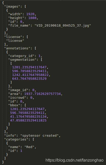 def get_red_voc():img_path = './train_all_2020_05_31'json_path = './train_all_2020_05_31.json'xml_dir = './Annotations'# img_path = './train_all_2019_7_18'# json_path = './train_all_2019_7_18.json'# xml_dir = './Annotations'if not os.path.exists(xml_dir):os.mkdir(xml_dir)with open(json_path) as file:json_info = json.load(file)print(json_info.keys())images_info = json_info['images']annotations_info = json_info['annotations']for i, image_info in enumerate(images_info):# if i<1:print('==image_info', image_info)name = image_info['file_name']print('==name:', name)img_list_path = os.path.join(img_path, name)img = cv2.imread(img_list_path)img_h, img_w, _ = img.shapeimg_id = image_info['id']xml_file = open((xml_dir + '/' + name.split('.jpg')[0] + '.xml'), 'w')xml_file.write('<annotation>\n')xml_file.write(' <folder>red_voc</folder>\n')xml_file.write(' <filename>' + name + '</filename>\n')xml_file.write(' <size>\n')xml_file.write(' <width>' + str(img_w) + '</width>\n')xml_file.write(' <height>' + str(img_h) + '</height>\n')xml_file.write(' <depth>3</depth>\n')xml_file.write(' </size>\n')for annotation_info in annotations_info:# print(annotation_info)if img_id == annotation_info['image_id']:# print('==annotation_info', annotation_info)if len(annotation_info['segmentation'])==1:box = annotation_info['segmentation'][0]else:box = annotation_info['segmentation']# print('==box', box)box = np.array(box).reshape(-1, 2)x1, y1, x2, y2 = np.min(box[:, 0]), np.min(box[:, 1]),np.max(box[:, 0]), np.max(box[:, 1])# print('x1, y1, x2, y2+', x1, y1, x2, y2)xml_file.write(' <object>\n')xml_file.write(' <name>' + 'red' + '</name>\n')xml_file.write(' <pose>Unspecified</pose>\n')xml_file.write(' <truncated>0</truncated>\n')xml_file.write(' <difficult>0</difficult>\n')xml_file.write(' <bndbox>\n')xml_file.write(' <xmin>' + str(int(x1)) + '</xmin>\n')xml_file.write(' <ymin>' + str(int(y1)) + '</ymin>\n')xml_file.write(' <xmax>' + str(int(x2)) + '</xmax>\n')xml_file.write(' <ymax>' + str(int(y2)) + '</ymax>\n')xml_file.write(' </bndbox>\n')xml_file.write(' </object>\n')xml_file.write('</annotation>')def _get_annotation(image_id):annotation_file = "Annotations/{}.xml".format(image_id)img_path = "train_all_2020_05_31/{}.jpg".format(image_id)h, w, _ = cv2.imread(img_path).shape# print('===annotation_file,', annotation_file)objects = ET.parse(annotation_file).findall("object")# class_dict = {'BACKGROUND': 0, 'person': 1, 'bicycle': 2, 'car': 3, 'motorcycle': 4, 'airplane': 5, 'bus': 6, 'train': 7, 'truck': 8, 'boat': 9, 'traffic light': 10, 'fire hydrant': 11, 'stop sign': 12, 'parking meter': 13, 'bench': 14, 'bird': 15, 'cat': 16, 'dog': 17, 'horse': 18, 'sheep': 19, 'cow': 20, 'elephant': 21, 'bear': 22, 'zebra': 23, 'giraffe': 24, 'backpack': 25, 'umbrella': 26, 'handbag': 27, 'tie': 28, 'suitcase': 29, 'frisbee': 30, 'skis': 31, 'snowboard': 32, 'sports ball': 33, 'kite': 34, 'baseball bat': 35, 'baseball glove': 36, 'skateboard': 37, 'surfboard': 38, 'tennis racket': 39, 'bottle': 40, 'wine glass': 41, 'cup': 42, 'fork': 43, 'knife': 44, 'spoon': 45, 'bowl': 46, 'banana': 47, 'apple': 48, 'sandwich': 49, 'orange': 50, 'broccoli': 51, 'carrot': 52, 'hot dog': 53, 'pizza': 54, 'donut': 55, 'cake': 56, 'chair': 57, 'couch': 58, 'potted plant': 59, 'bed': 60, 'dining table': 61, 'toilet': 62, 'tv': 63, 'laptop': 64, 'mouse': 65, 'remote': 66, 'keyboard': 67, 'cell phone': 68, 'microwave': 69, 'oven': 70, 'toaster': 71, 'sink': 72, 'refrigerator': 73, 'book': 74, 'clock': 75, 'vase': 76, 'scissors': 77, 'teddy bear': 78, 'hair drier': 79, 'toothbrush': 80}class_dict = {'BACKGROUND': 0, 'red': 1}# print('==objects', objects)boxes = []labels = []is_difficult = []for object in objects:class_name = object.find('name').text.lower().strip()# we're only concerned with clases in our listif class_name in class_dict:bbox = object.find('bndbox')if bbox is not None:# VOC dataset format follows Matlab, in which indexes start from 0x1 = float(bbox.find('xmin').text)y1 = float(bbox.find('ymin').text)x2 = float(bbox.find('xmax').text)y2 = float(bbox.find('ymax').text)boxes.append([x1, y1, x2, y2])labels.append(class_dict[class_name])is_difficult_str = object.find('difficult').textis_difficult.append(int(is_difficult_str) if is_difficult_str else 0)else:polygons = object.find('polygon')x = []y = []for polygon in polygons.iter('pt'):# scale height or widthx.append(int(polygon.find('x').text))y.append(int(polygon.find('y').text))boxes.append([min(x), min(y), max(x), max(y)])labels.append(self.class_dict[class_name])is_difficult.append(0)return (np.array(boxes, dtype=np.float32),np.array(labels, dtype=np.int64),np.array(is_difficult, dtype=np.uint8))def show_box():img_path = './train_all_2020_05_31'out_path = './train_all_2020_05_31_out'if not os.path.exists(out_path):os.mkdir(out_path)xml_path ='./Annotations'imgs_id = [i.split('.xml')[0] for i in os.listdir(xml_path)]for img_id in imgs_id:# if img_id =='000000049777':print('==img_id:', img_id)boxes, labels, is_difficult = _get_annotation(img_id)print('==boxes, labels, is_difficult', boxes, labels, is_difficult)img = cv2.imread(os.path.join(img_path, img_id+'.jpg'))for box in boxes:cv2.rectangle(img, (box[0], box[1]), (box[2], box[3]), thickness=1, color=(255, 255, 255))cv2.imwrite(os.path.join(out_path, img_id+'.jpg'), img)if __name__ == '__main__':get_red_voc()# show_box()