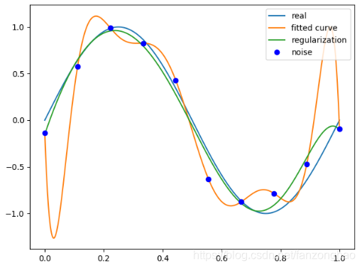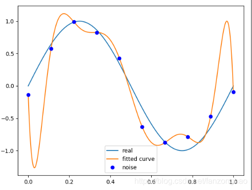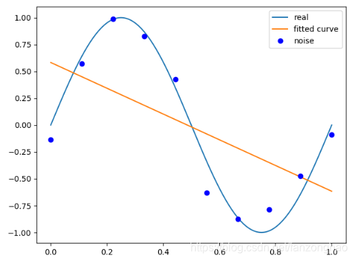 y = [np.random.normal(0, 0.1) + y1 for y1 in y_]def fitting(M=0):"""M 为 多项式的次数"""# 随机初始化多项式参数p_init = np.random.rand(M + 1)# 最小二乘法p_lsq = leastsq(residuals_func, p_init, args=(x, y))print('Fitting Parameters:', p_lsq[0])## 可视化plt.plot(x_points, real_func(x_points), label='real')plt.plot(x_points, fit_func(p_lsq[0], x_points), label='fitted curve')plt.plot(x, y, 'bo', label='noise')plt.legend()plt.show()return p_lsq