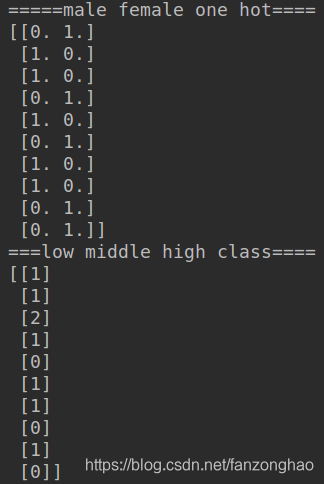 def one_hot():# 随机生成有序型特征和类别特征作为例子X_train = np.array([['male', 'low'],['female', 'low'],['female', 'middle'],['male', 'low'],['female', 'high'],['male', 'low'],['female', 'low'],['female', 'high'],['male', 'low'],['male', 'high']])X_test = np.array([['male', 'low'],['male', 'low'],['female', 'middle'],['female', 'low'],['female', 'high']])from sklearn.preprocessing import LabelEncoder, OneHotEncoder# 在训练集上进行编码操作label_enc1 = LabelEncoder() # 首先将male, female用数字编码one_hot_enc = OneHotEncoder() # 将数字编码转换为独热编码label_enc2 = LabelEncoder() # 将low, middle, high用数字编码tr_feat1_tmp = label_enc1.fit_transform(X_train[:, 0]).reshape(-1, 1) # reshape(-1, 1)保证为一维列向量tr_feat1 = one_hot_enc.fit_transform(tr_feat1_tmp)tr_feat1 = tr_feat1.todense()print('=====male female one hot====')print(tr_feat1)tr_feat2 = label_enc2.fit_transform(X_train[:, 1]).reshape(-1, 1)print('===low middle high class====')print(tr_feat2)X_train_enc = np.hstack((tr_feat1, tr_feat2))print('=====train encode====')print(X_train_enc)# 在测试集上进行编码操作te_feat1_tmp = label_enc1.transform(X_test[:, 0]).reshape(-1, 1) # reshape(-1, 1)保证为一维列向量te_feat1 = one_hot_enc.transform(te_feat1_tmp)te_feat1 = te_feat1.todense()te_feat2 = label_enc2.transform(X_test[:, 1]).reshape(-1, 1)X_test_enc = np.hstack((te_feat1, te_feat2))print('====test encode====')print(X_test_enc)