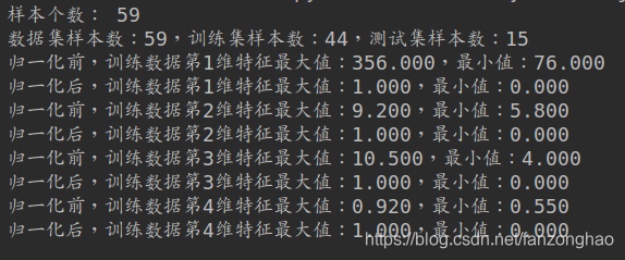 def minmax_scaler(X_train,X_test):scaler = MinMaxScaler()X_train_scaled = scaler.fit_transform(X_train)# print(X_train_scaled)#此时scaled得到一个最小最大值,对于test直接transform就行X_test_scaled = scaler.transform(X_test)for i in range(4):print('归一化前,训练数据第{}维特征最大值:{:.3f},最小值:{:.3f}'.format(i + 1,X_train.iloc[:, i].max(),X_train.iloc[:, i].min()))print('归一化后,训练数据第{}维特征最大值:{:.3f},最小值:{:.3f}'.format(i + 1,X_train_scaled[:, i].max(),X_train_scaled[:, i].min()))return X_train_scaled,X_test_scaled