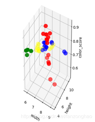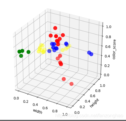 def show_3D(X_train,X_train_scaled):label_color_dict = {1: 'red', 2: 'green', 3: 'blue', 4: 'yellow'}colors = list(map(lambda label: label_color_dict[label], y_train))print(colors)print(len(colors))fig = plt.figure()ax1 = fig.add_subplot(111, projection='3d', aspect='equal')ax1.scatter(X_train['width'], X_train['height'], X_train['color_score'], c=colors, marker='o', s=100)ax1.set_xlabel('width')ax1.set_ylabel('height')ax1.set_zlabel('color_score')plt.show()fig = plt.figure()ax2 = fig.add_subplot(111, projection='3d', aspect='equal')ax2.scatter(X_train_scaled[:, 1], X_train_scaled[:, 2], X_train_scaled[:, 3], c=colors, marker='o', s=100)ax2.set_xlabel('width')ax2.set_ylabel('height')ax2.set_zlabel('color_score')plt.show()