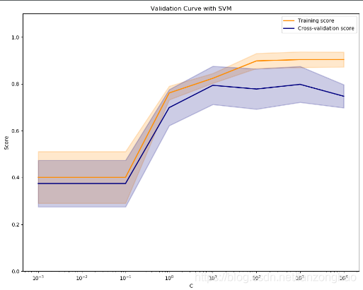 def show_effect(X_train_scaled, y_train):from sklearn.model_selection import validation_curvefrom sklearn.svm import SVCc_range = [1e-3, 1e-2, 0.1, 1, 10, 100, 1000, 10000]train_scores, test_scores = validation_curve(SVC(kernel='linear'), X_train_scaled, y_train,param_name='C', param_range=c_range,cv=5, scoring='accuracy')print(train_scores)print(train_scores.shape)train_scores_mean = np.mean(train_scores, axis=1)# print(train_scores_mean)train_scores_std = np.std(train_scores, axis=1)test_scores_mean = np.mean(test_scores, axis=1)test_scores_std = np.std(test_scores, axis=1)#plt.figure(figsize=(10, 8))plt.title('Validation Curve with SVM')plt.xlabel('C')plt.ylabel('Score')plt.ylim(0.0, 1.1)lw = 2plt.semilogx(c_range, train_scores_mean, label="Training score",color="darkorange", lw=lw)plt.fill_between(c_range, train_scores_mean - train_scores_std,train_scores_mean + train_scores_std, alpha=0.2,color="darkorange", lw=lw)plt.semilogx(c_range, test_scores_mean, label="Cross-validation score",color="navy", lw=lw)plt.fill_between(c_range, test_scores_mean - test_scores_std,test_scores_mean + test_scores_std, alpha=0.2,color="navy", lw=lw)plt.legend(loc="best")plt.show()# 从上图可知对SVM,C=100为最优参数svm_model = SVC(kernel='linear', C=1000)svm_model.fit(X_train_scaled, y_train)print(svm_model.score(X_test_scaled, y_test))