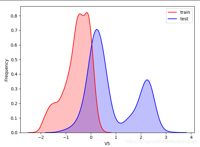 可看出,train有2888行数据,test有1925行数据,然后查看train和test的每列数据的分布,横坐标是特征名,从v0到37,下面选择了v4和v5,可看出v4的train和test分布接近,而v5相差较大,类似较大的还有"V9","V11","V17","V22","V28",故可以删掉这些列特征。