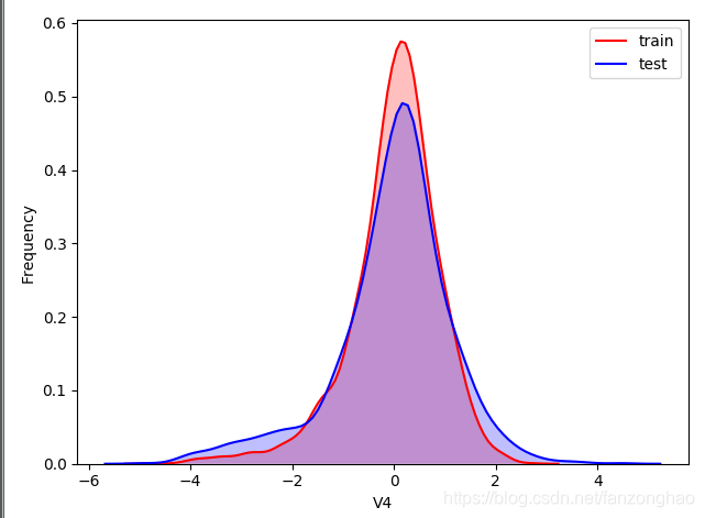 for column in data_all.columns[0:-2]:g = sns.kdeplot(data_all[column][(data_all["oringin"] == "train")], color="Red", shade = True)g = sns.kdeplot(data_all[column][(data_all["oringin"] == "test")], color="Blue", shade= True)g.set(xlabel=column,ylabel='Frequency')g = g.legend(["train","test"])plt.show()