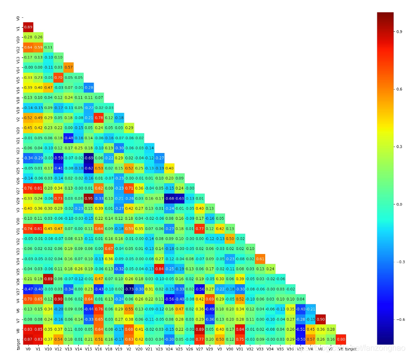 def del_feature(data_train,data_test):data_train["oringin"]="train"data_test["oringin"]="test"data_all=pd.concat([data_train,data_test],axis=0,ignore_index=True)"""删除特征"V5","V9","V11","V17","V22","V28",训练集和测试集分布不一致"""data_all.drop(["V5","V9","V11","V17","V22","V28"],axis=1,inplace=True)# print('drop after data_all.shape=',data_all.shape)# figure parametersdata_train= data_all[data_all["oringin"] == "train"].drop("oringin", axis=1)# print('drop after data_train.shape=',data_train.shape)"""'V14', u'V21', u'V25', u'V26', u'V32', u'V33', u'V34'"""# Threshold for removing correlated variablesthreshold = 0.1# Absolute value correlation matrixcorr_matrix = data_train.corr().abs()drop_col=corr_matrix[corr_matrix["target"]<threshold].index# print('drop_col=',drop_col)data_all.drop(drop_col,axis=1,inplace=True)# print('data_all.shape=',data_all.shape)return data_all