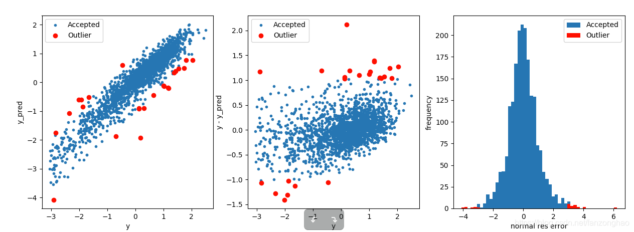 def find_outliers(model, X, y, sigma=3):# predict y values using modeltry:y_pred = pd.Series(model.predict(X), index=y.index)# if predicting fails, try fitting the model firstexcept:model.fit(X, y)y_pred = pd.Series(model.predict(X), index=y.index)# calculate residuals between the model prediction and true y valuesresid = y - y_predmean_resid = resid.mean()std_resid = resid.std()# calculate z statistic, define outliers to be where |z|>sigmaz = (resid - mean_resid) / std_resid#找出方差大于3的数据的索引,然后丢掉outliers = z[abs(z) > sigma].index# print and plot the resultsprint('score=', model.score(X, y))print('rmse=', rmse(y, y_pred))print("mse=", mean_squared_error(y, y_pred))print('---------------------------------------')print('mean of residuals:', mean_resid)print('std of residuals:', std_resid)print('---------------------------------------')print(len(outliers), 'outliers:')print(outliers.tolist())plt.figure(figsize=(15, 5))plt.subplot(1, 3, 1)plt.plot(y, y_pred, '.')plt.plot(y.loc[outliers], y_pred.loc[outliers], 'ro')plt.legend(['Accepted', 'Outlier'])plt.xlabel('y')plt.ylabel('y_pred')plt.subplot(1, 3, 2)plt.plot(y, y - y_pred, '.')plt.plot(y.loc[outliers], y.loc[outliers] - y_pred.loc[outliers], 'ro')plt.legend(['Accepted', 'Outlier'])plt.xlabel('y')plt.ylabel('y - y_pred')plt.subplot(1, 3, 3)plt.hist(z,bins=50)plt.hist(z.loc[outliers],color='r', bins=50)plt.legend(['Accepted', 'Outlier'])plt.xlabel('normal res error')plt.ylabel('frequency')plt.savefig('outliers.png')return outliers# get training data