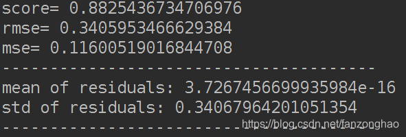 def find_outliers(model, X, y, sigma=3):# predict y values using modeltry:y_pred = pd.Series(model.predict(X), index=y.index)# if predicting fails, try fitting the model firstexcept:model.fit(X, y)y_pred = pd.Series(model.predict(X), index=y.index)# calculate residuals between the model prediction and true y valuesresid = y - y_predmean_resid = resid.mean()std_resid = resid.std()# calculate z statistic, define outliers to be where |z|>sigmaz = (resid - mean_resid) / std_resid#找出方差大于3的数据的索引,然后丢掉outliers = z[abs(z) > sigma].index# print and plot the resultsprint('score=', model.score(X, y))print('rmse=', rmse(y, y_pred))print("mse=", mean_squared_error(y, y_pred))print('---------------------------------------')print('mean of residuals:', mean_resid)print('std of residuals:', std_resid)print('---------------------------------------')return outliersdef get_trainning_data_omitoutliers(X_t,y_t):y1=y_t.copy()X1=X_t.copy()return X1,y1def scale_minmax(col):return (col - col.min()) / (col.max() - col.min())def normal(data_all):"""归一化"""cols_numeric = list(data_all.columns)cols_numeric.remove("oringin")scale_cols = [col for col in cols_numeric if col != 'target']print('scale_cols=', scale_cols)data_all[scale_cols] = data_all[scale_cols].apply(scale_minmax, axis=0)return data_allif __name__ == '__main__':with open("data/zhengqi_train.txt") as fr:data_train = pd.read_table(fr, sep="\t")with open("data/zhengqi_test.txt") as fr_test:data_test = pd.read_table(fr_test, sep="\t")data_all=del_feature(data_train,data_test)print('clear data_all.shape',data_all.shape)data_all=normal(data_all)X_train, X_valid, y_train, y_valid = get_training_data(data_all)print('X_train.shape=', X_train.shape)print('X_valid.shape=', X_valid.shape)X_test=get_test_data(data_all)print('X_test.shape',X_test.shape)# find and remove outliers using a Ridge modeloutliers = find_outliers(Ridge(), X_train, y_train)""" permanently remove these outliers from the data"""X_train,y_train=get_trainning_data_omitoutliers(X_train.drop(outliers),y_train.drop(outliers))X1=pd.concat([X_train,y_train],axis=1)X2=pd.concat([X_valid,y_valid],axis=1)X_all=pd.concat([X1,X2],axis=0)print(X_all)y = X_all['target']X = X_all.drop(["target"], axis=1)print(X.shape)X_train, X_valid, y_train, y_valid = train_test_split(X, y, test_size=0.3, random_state=100)poly_trans = PolynomialFeatures(degree=2)X_train = poly_trans.fit_transform(X_train)print(X_train.shape)X_valid = poly_trans.fit_transform(X_valid)print(X_valid.shape)print('==============forest_model========================')forest_model = RandomForestRegressor(n_estimators=500,criterion='mse',max_depth=20,min_samples_leaf=3,max_features=0.4,random_state=1,bootstrap=False,n_jobs=-1)forest_model.fit(X_train,y_train)importance =forest_model.feature_importances_table = BeautifulTable()# table.column_headers = ["feature", "importance"]print('RF feature importance:')# print(data_all)for i, cols in enumerate(X_all.iloc[:, :-1]):table.append_row([cols, round(importance[i], 3)])print(table)y_pred = forest_model.predict(X_valid)y_valid_rmse=rmse(y_valid,y_pred)print('y_valid_rmse=',y_valid_rmse)y_valid_mse = mse(y_valid, y_pred)print('y_valid_mse=',y_valid_mse)y_valid_score=forest_model.score(X_valid,y_valid)print('y_valid_score=',y_valid_score)with open("forest_model.pkl", "wb") as f:pickle.dump(forest_model, f)with open("forest_model.pkl", "rb") as f:model = pickle.load(f)y_pred = model.predict(X_valid)y_valid_rmse = rmse(y_valid, y_pred)print('y_valid_rmse=', y_valid_rmse)y_valid_mse = mse(y_valid, y_pred)print('y_valid_mse=', y_valid_mse)y_valid_score = model.score(X_valid, y_valid)print('y_valid_score=', y_valid_score)