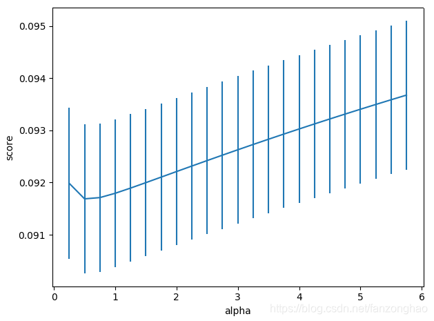 plt.errorbar(alph_range, abs(grid_results['mean_test_score']),abs(grid_results['std_test_score'])/np.sqrt(splits*repeats))