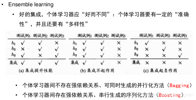 - Boosting 基于串行策略:基学习器之间存在依赖关系,新的学习器需要依据旧的学习器生成。