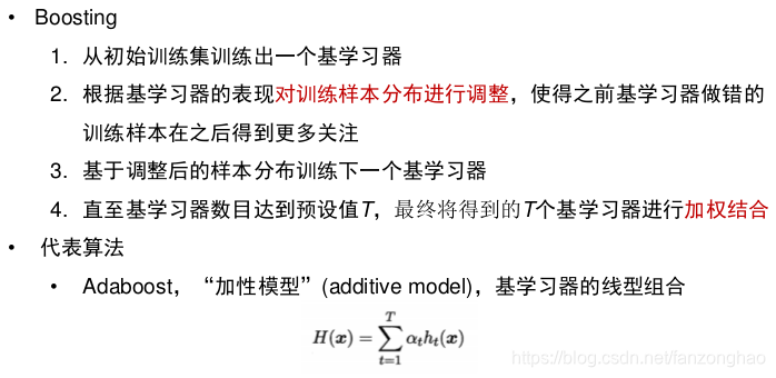 - Boosting(提升)方法从某个基学习器出发,反复学习,得到一系列基学习器,然后组合它们构成一个强学习器。
