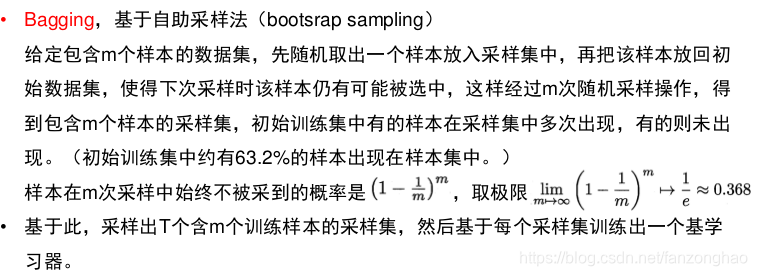 - Bagging 基于并行策略:基学习器之间不存在依赖关系,可同时生成。