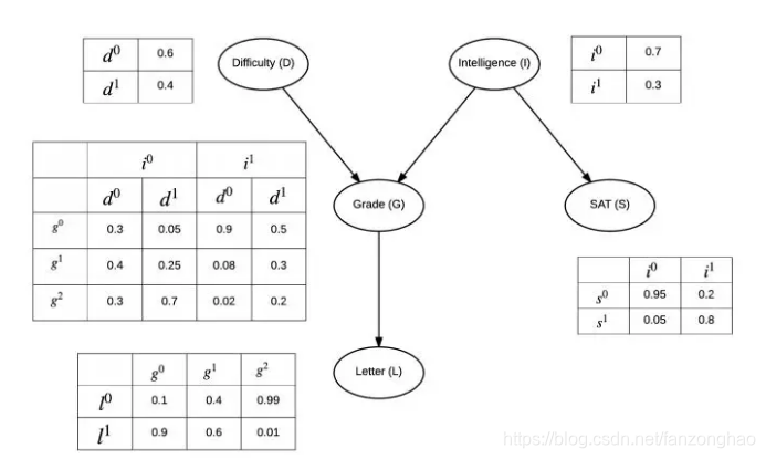 下图是学生获得推荐信质量的例子。具体有向图和概率表如下图所示: