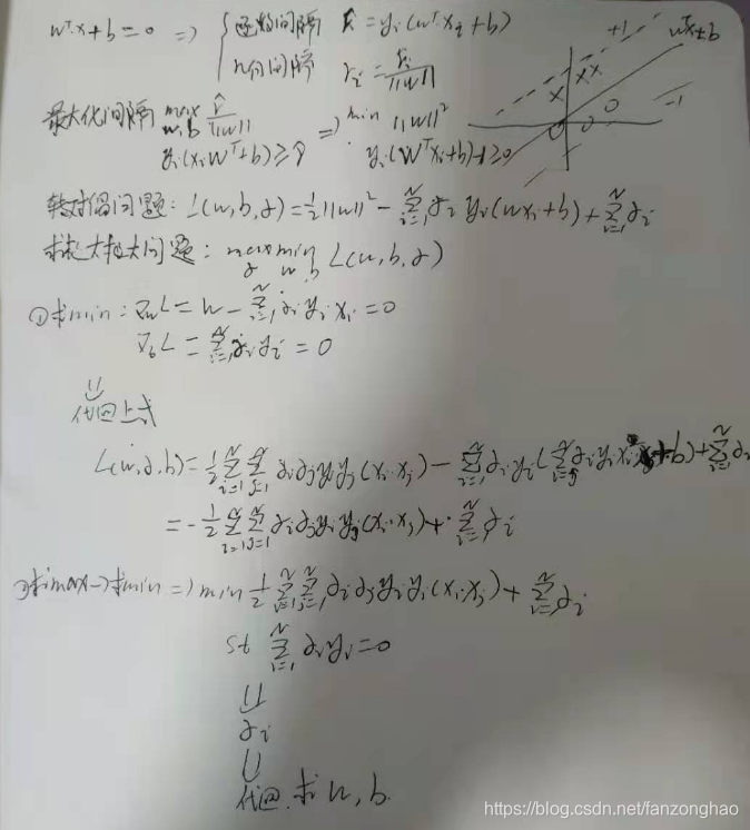class SVM:def __init__(self, max_iter=100, kernel='linear'):self.max_iter = max_iterself._kernel = kerneldef init_args(self, features, labels):self.m, self.n = features.shape#m数据量 n特征维度self.X = featuresself.Y = labelsself.b = 0.0# 将Ei保存在一个列表里self.alpha = np.ones(self.m)self.E = [self._E(i) for i in range(self.m)]# 松弛变量self.C = 1.0def _KKT(self, i):y_g = self._g(i) * self.Y[i]if self.alpha[i] == 0:return y_g >= 1elif 0 < self.alpha[i] < self.C:return y_g == 1else:return y_g <= 1# g(x)预测值,输入xi(X[i])def _g(self, i):r = self.bfor j in range(self.m):r += self.alpha[j] * self.Y[j] * self.kernel(self.X[i], self.X[j])return r# E(x)为g(x)对输入x的预测值和y的差def _E(self, i):return self._g(i) - self.Y[i]# 核函数def kernel(self, x1, x2):if self._kernel == 'linear':return sum([x1[k] * x2[k] for k in range(self.n)])elif self._kernel == 'poly':return (sum([x1[k] * x2[k] for k in range(self.n)]) + 1)**2return 0def _init_alpha(self):# 外层循环首先遍历所有满足0<a<C的样本点,检验是否满足KKTindex_list = [i for i in range(self.m) if 0 < self.alpha[i] < self.C]# 否则遍历整个训练集non_satisfy_list = [i for i in range(self.m) if i not in index_list]index_list.extend(non_satisfy_list)for i in index_list:if self._KKT(i):continueE1 = self.E[i]# 如果E2是+,选择最小的;如果E2是负的,选择最大的if E1 >= 0:j = min(range(self.m), key=lambda x: self.E[x])else:j = max(range(self.m), key=lambda x: self.E[x])return i, jdef _compare(self, _alpha, L, H):if _alpha > H:return Helif _alpha < L:return Lelse:return _alphadef fit(self, features, labels):self.init_args(features, labels)for t in range(self.max_iter):# traini1, i2 = self._init_alpha()# 边界if self.Y[i1] == self.Y[i2]:L = max(0, self.alpha[i1] + self.alpha[i2] - self.C)H = min(self.C, self.alpha[i1] + self.alpha[i2])else:L = max(0, self.alpha[i2] - self.alpha[i1])H = min(self.C, self.C + self.alpha[i2] - self.alpha[i1])E1 = self.E[i1]E2 = self.E[i2]# eta=K11+K22-2K12eta = self.kernel(self.X[i1], self.X[i1]) + self.kernel(self.X[i2],self.X[i2]) - 2 * self.kernel(self.X[i1], self.X[i2])if eta <= 0:# print('eta <= 0')continuealpha2_new_unc = self.alpha[i2] + self.Y[i2] * (E1 - E2) / eta #此处有修改,根据书上应该是E1 - E2,书上130-131页alpha2_new = self._compare(alpha2_new_unc, L, H)alpha1_new = self.alpha[i1] + self.Y[i1] * self.Y[i2] * (self.alpha[i2] - alpha2_new)b1_new = -E1 - self.Y[i1] * self.kernel(self.X[i1], self.X[i1]) * (alpha1_new - self.alpha[i1]) - self.Y[i2] * self.kernel(self.X[i2],self.X[i1]) * (alpha2_new - self.alpha[i2]) + self.bb2_new = -E2 - self.Y[i1] * self.kernel(self.X[i1], self.X[i2]) * (alpha1_new - self.alpha[i1]) - self.Y[i2] * self.kernel(self.X[i2],self.X[i2]) * (alpha2_new - self.alpha[i2]) + self.bif 0 < alpha1_new < self.C:b_new = b1_newelif 0 < alpha2_new < self.C:b_new = b2_newelse:# 选择中点b_new = (b1_new + b2_new) / 2# 更新参数self.alpha[i1] = alpha1_newself.alpha[i2] = alpha2_newself.b = b_newself.E[i1] = self._E(i1)self.E[i2] = self._E(i2)return 'train done!'def predict(self, data):r = self.bfor i in range(self.m):r += self.alpha[i] * self.Y[i] * self.kernel(data, self.X[i])return 1 if r > 0 else -1def score(self, X_test, y_test):right_count = 0for i in range(len(X_test)):result = self.predict(X_test[i])if result == y_test[i]:right_count += 1return right_count / len(X_test)# def _weight(self):# # linear model# yx = self.Y.reshape(-1, 1) * self.X# self.w = np.dot(yx.T, self.alpha)# return self.wsvm = SVM(max_iter=200)