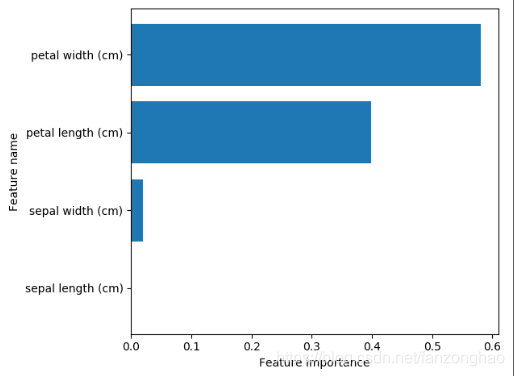 def plot_feature_importances(clf, feature_names):"""可视化分类器中特征的重要性"""c_features = len(feature_names)plt.barh(range(c_features), clf.feature_importances_)plt.xlabel('Feature importance')plt.ylabel('Feature name')plt.yticks(np.arange(c_features), feature_names)plt.show()iris = load_iris()X_train, X_test, y_train, y_test = train_test_split(iris.data, iris.target, random_state=0)max_depth_values = [2, 3, 4]for max_depth_val in max_depth_values:dt_model = DecisionTreeClassifier(max_depth=max_depth_val)dt_model.fit(X_train, y_train)print('max_depth=', max_depth_val)print('训练集上的准确率: {:.3f}'.format(dt_model.score(X_train, y_train)))print('测试集的准确率: {:.3f}'.format(dt_model.score(X_test, y_test)))print()dt_model = DecisionTreeClassifier(max_depth=4)