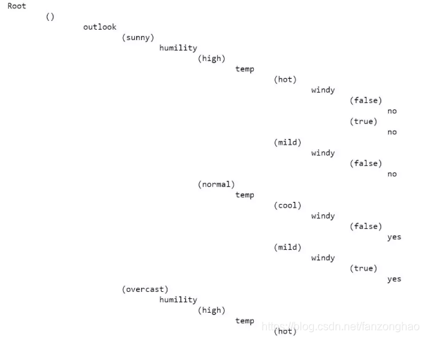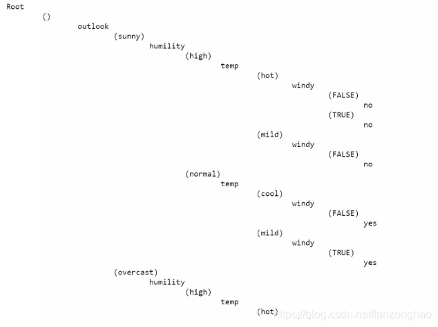 def choose_best_col(data, label):# print('==data[label].tolist():', data[label].tolist())entropy_D = entropy(data[label].tolist())cols = [col for col in data.columns if col not in [label]]max_value, best_col = -999, Nonemax_splited = Nonefor col in cols:# print('col:', col)splited_set = split_dataframe(data, col)print('splited_set:\n', splited_set)# print('==========\n', splited_set['normal'])entropy_DA = 0for subset_col, subset in splited_set.items():print('============subset_col, subset\n', subset_col, subset)# assert 1 == 0entropy_Di = entropy(subset[label].tolist())entropy_DA += len(subset) / len(data) * entropy_Diinfo_gain = entropy_D - entropy_DAif info_gain > max_value:max_value, best_col = info_gain, colmax_splited = splited_setreturn max_value, best_col, max_splitedclass ID3Tree:class Node:def __init__(self, name):self.name = nameself.connections = {}def connect(self, label, node):self.connections[label] = nodedef __init__(self, data, label):self.columns = data.columns# print('self.columns:', self.columns)self.data = dataself.label = labelself.root = self.Node("Root")def print_tree(self, node, tabs):# print('tabs + node.name:\n', tabs + node.name)for connection, child_node in node.connections.items():print(tabs + "\t" + "(" + connection + ")")self.print_tree(child_node, tabs + "\t\t")def construct_tree(self):self.construct(self.root, "", self.data, self.columns)def construct(self, parent_node, parent_connection_label, input_data, columns):max_value, best_col, max_splited = choose_best_col(input_data[columns], self.label)# assert 1==0print('==best_col:', best_col)print('==not best_col:', not best_col)if not best_col:node = self.Node(input_data[self.label].iloc[0])parent_node.connect(parent_connection_label, node)returnnode = self.Node(best_col)parent_node.connect(parent_connection_label, node)new_columns = [col for col in columns if col != best_col]for splited_value, splited_data in max_splited.items():self.construct(node, splited_value, splited_data, new_columns)def test_best_gain_info():df = pd.read_csv('./example_data.csv', dtype={'windy' : 'str'})max_value, best_col, max_splited = choose_best_col(df, 'play')print('max_value, best_col, max_splited:\n', max_value, best_col, max_splited)def test_tree_construct():df = pd.read_csv('./example_data.csv', dtype={'windy': 'str'})id3 = ID3Tree(df, 'play')id3.construct_tree()id3.print_tree(id3.root, '')