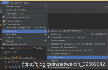 - 进入配置页面,Pycharm菜单栏,依次点击 Tools -> Deployment -> Configration