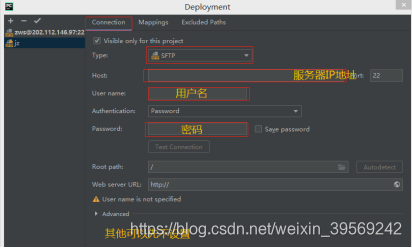 - 进入Mapping页面,设置服务器Deployment path,最好在服务器上建一个自己程序的文件夹,表示已经把本地的代码和服务器代码连接