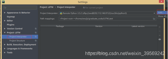 - 在菜单栏,File -> Settings… -> Project ×× -> Project Interpreter,点击右侧 Add按钮,添加解释器。