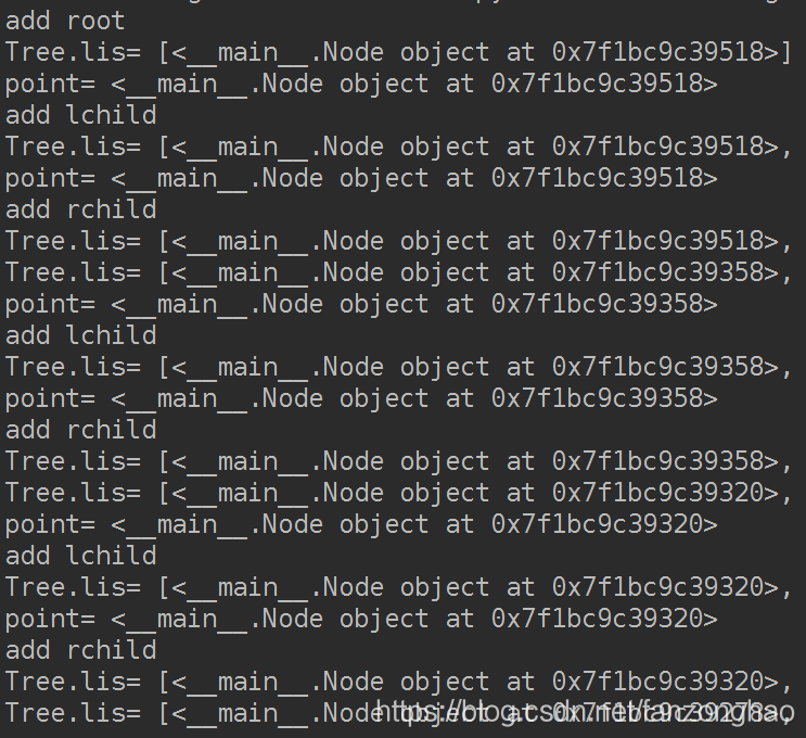 class Tree:lis=[]def __init__(self):self.root=None#增加节点def add(self,number):node=Node(number)if self.root==None:self.root=nodeprint('add root')Tree.lis.append(self.root)print('Tree.lis=', Tree.lis)else:while True:point=Tree.lis[0]print('point=',point)if point.lchild==None:point.lchild=nodeTree.lis.append(point.lchild)print('add lchild')print('Tree.lis=', Tree.lis)returnif point.rchild==None:point.rchild=nodeTree.lis.append(point.rchild)print('add rchild')print('Tree.lis=', Tree.lis)Tree.lis.pop(0)#更换root节点print('Tree.lis=', Tree.lis)return