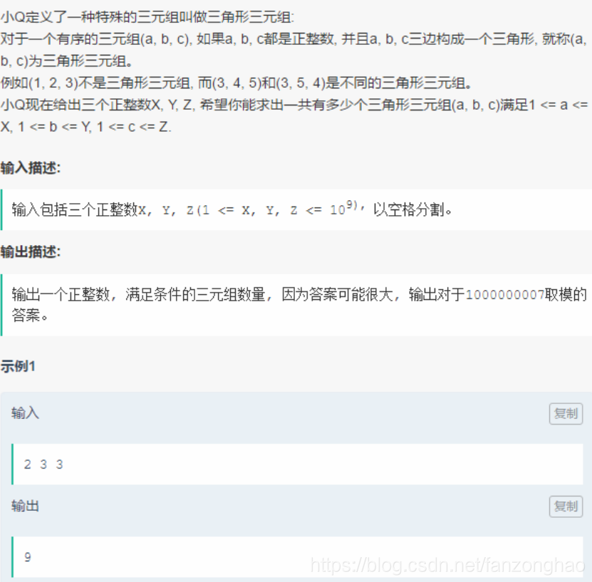 def solve(X,Y,Z):cnt = 0for a in range(1,X+1):for b in range(1,Y+1):#最短边min_c=abs(a-b)+1# print(min_c)# 最长边max_c=min(a+b-1,Z)# print(max_c)cnt+=max_c-min_c+1cnt%=1000000007return cnt