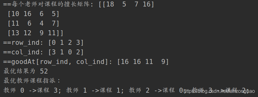 from scipy.optimize import linear_sum_assignmentdef printf(row_ind,col_ind):#输出print("最优教师课程指派:")for i in range(len(row_ind)):print("教师",row_ind[i], "->课程", col_ind[i],end='; ')print()