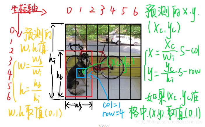 图片宽为wi,高为hi,box中心点(相对于格点)为(x,y),宽高比例为(wb,hb),col,row代表格点的列数和行数,S代表划分的行列数,预测的box中心点(相对于大图)为(xc,yc)