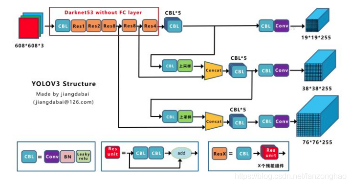 backbone采用去除全连接的darknet53,经过5次Res模块后,得到的特征图是608->304->152->76->38->19大小。