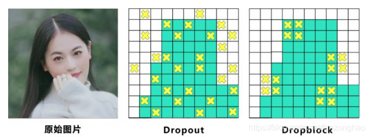 4.卷积层采用dropblock,类似cutout,只不过cutout作用于输入层数据,而dropblock作用于网络的每一个特征图,将某个局部区域删除丢弃,比dropout力度大;