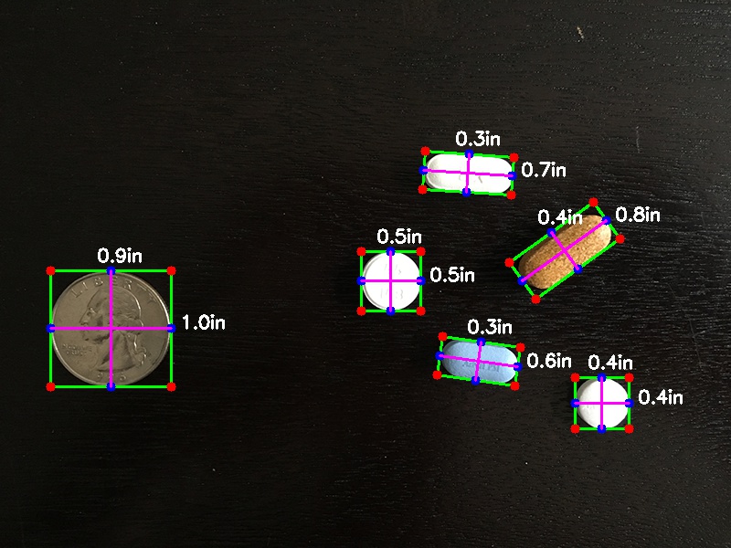 orig = image.copy()for c in cnts:if cv2.contourArea(c) < 100:continuebox = cv2.minAreaRect(c)box = cv2.cv.BoxPoints(box) if imutils.is_cv2() else cv2.boxPoints(box)box = np.array(box, dtype="int")print('box:',box)box = perspective.order_points(box)cv2.drawContours(orig, [box.astype("int")], -1, (0, 255, 0), 2)for (x, y) in box:cv2.circle(orig, (int(x), int(y)), 5, (0, 0, 255), -1)(tl, tr, br, bl) = box(tltrX, tltrY) = midpoint(tl, tr)(blbrX, blbrY) = midpoint(bl, br)(tlblX, tlblY) = midpoint(tl, bl)(trbrX, trbrY) = midpoint(tr, br)# draw the midpoints on the imagecv2.circle(orig, (int(tltrX), int(tltrY)), 5, (255, 0, 0), -1)cv2.circle(orig, (int(blbrX), int(blbrY)), 5, (255, 0, 0), -1)cv2.circle(orig, (int(tlblX), int(tlblY)), 5, (255, 0, 0), -1)cv2.circle(orig, (int(trbrX), int(trbrY)), 5, (255, 0, 0), -1)# draw lines between the midpointscv2.line(orig, (int(tltrX), int(tltrY)), (int(blbrX), int(blbrY)),(255, 0, 255), 2)cv2.line(orig, (int(tlblX), int(tlblY)), (int(trbrX), int(trbrY)),(255, 0, 255), 2)# compute the Euclidean distance between the midpointsdA = dist.euclidean((tltrX, tltrY), (blbrX, blbrY))dB = dist.euclidean((tlblX, tlblY), (trbrX, trbrY))# if the pixels per metric has not been initialized, then# compute it as the ratio of pixels to supplied metric# (in this case, inches)if pixelsPerMetric is None:pixelsPerMetric = dB / WIDTH# compute the size of the objectdimA = dA / pixelsPerMetricdimB = dB / pixelsPerMetric# draw the object sizes on the imagecv2.putText(orig, "{:.1f}in".format(dimA),(int(tltrX - 15), int(tltrY - 10)), cv2.FONT_HERSHEY_SIMPLEX,0.65, (255, 255, 255), 2)cv2.putText(orig, "{:.1f}in".format(dimB),(int(trbrX + 10), int(trbrY)), cv2.FONT_HERSHEY_SIMPLEX,0.65, (255, 255, 255), 2)