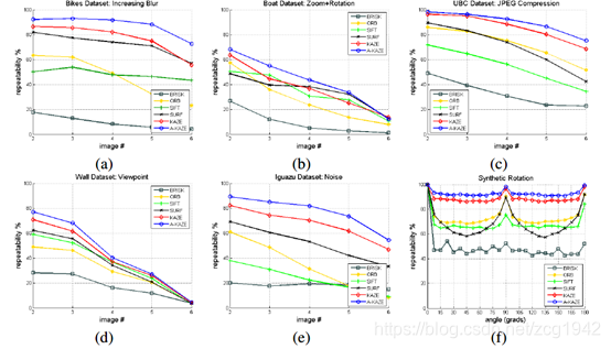 我们使用文献9中的VLBenchmarks框架来评估检测器的可重复度http://www.vlfeat.org/benchmarks/。VLBenchmarks是一个MATLAB的框架,用于测试图像特征检测和描述子,使用了文献12中对于局部检测器评估的协议。重复度衡量的是包含相同场景的两幅不同的图像在特征检测之后被检测到的区域的重叠程度。The detector repeatability measures to what extent do detected regions overlap exactly the same scene region by comparing detected features in two images of the same scene.我们认为当重叠错误率overlap error小于40%时认为是对应的correspondence。此外,我们还附加认为对应区域的特征点的相对位置必须小于2.5个像素,例如 ,H是两幅图像之间单应矩阵真值true homography。实验比较了A-KAZE与BRISK、ORB、SURF、SIFT和KAZE。KAZE使用了作者的源码,其余算法使用了OpenCV库。