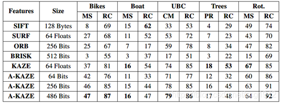 我们还使用随机比特选择的方法测试了改变描述子的大小对于性能的影响。在表1中可以看到,486bits的A-KAZE和KAZE在大部分实验中都取得了最好的表现,例外是在Boat图像组中SIFT取得了更好的效果。256bits版本的A-KAZE的性能和486bits版本相近,更有意思的是,64bits版本的A-KAZE在近一半的情景下甚至可以取得比原始版本A-KAZE更好的表现。