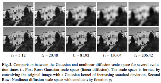 需要注意的是,t与 的关系只是在构建尺度空间时两种参数之间的对应关系,二者对应得到的图像之间没有对应关系。不过,当我们选择的扩散函数g是常数1的话,可以得到等效于高斯尺度空间的结果。事实上,在非线性尺度空间中,随着进化的进行,在大部分像素部分,传导函数会趋于常数,例外就是图像的边缘部分。