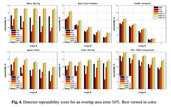 上图展示了不同图像变换下不同算法的重复度表现。可以看到不同的变换关系下表现最好的都是KAZE,在模拟高斯噪声情况下,KAZE的重复度比SURF和STAR高出20%,比SIFT高出40%。其中又以传导函数g2表现最好。 更适合宽大区域如被Hessian检测出的blob-like features。 适用于高对比度的边缘如角点检测corner detection。