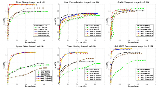上图就是precision-recall图,使用的匹配策略是最近邻匹配。除了Boat和Graffti图像组,其他图像组中KAZE都明显高于其他算法。即便在Boat和Graffti中,KAZE的correspondences的数目也大约是SURF和SIFT的两倍(算法示例的括号里面就是correspondences的数目)。