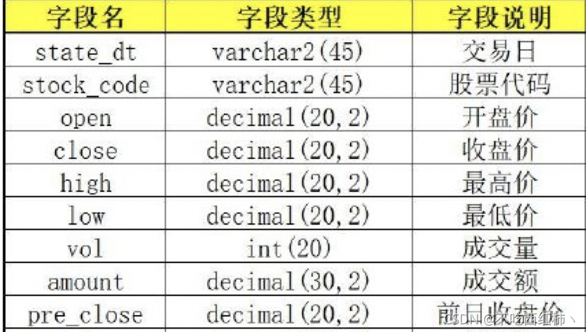 其中 state_dt 和 stock_code 是主键和索引。state_dt 的格式是 ‘yyyy-mm-dd’(例:'2018-06-11')。这样的日期格式便于查询,且在MySQL内部能够进行大小比较。
