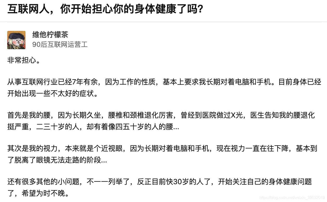- 盯屏幕12h感觉眼睛、颈椎都要废了。眼睛不是时时刻刻盯着屏幕的吧, 也可以遥望远处,每30分钟眺望一次,电脑屏幕有时候要等待,也可以闭眼一会,你睁开眼睛的时候页面就打开了。