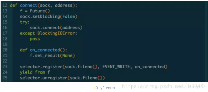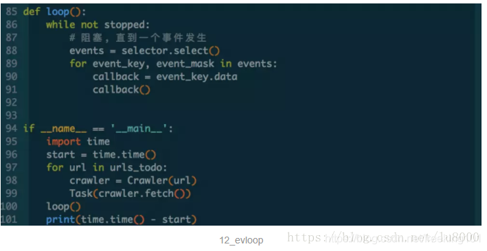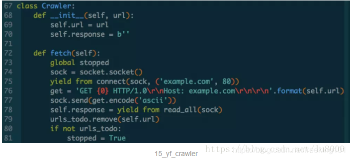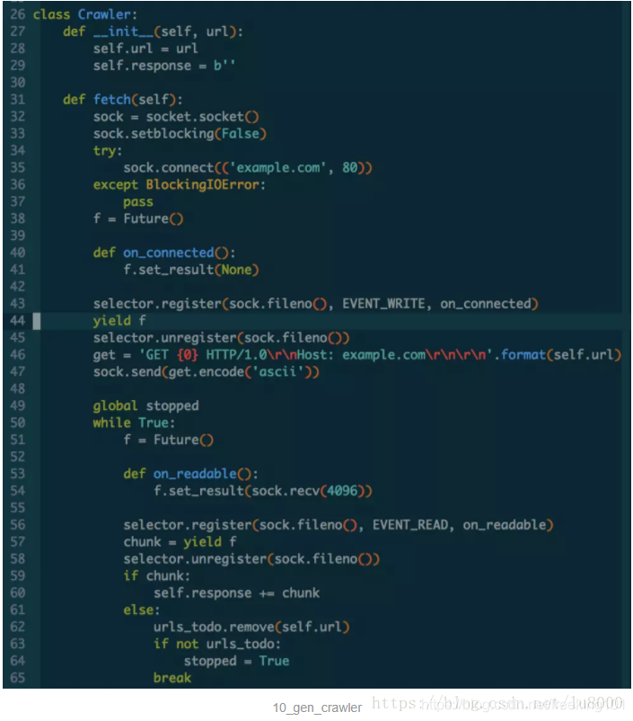 urls_todo = {'/', '/1', '/2', '/3', '/4', '/5', '/6', '/7', '/8', '/9'}class Future(object):def __init__(self):self.result = Noneself._callbacks = []def add_done_callback(self, fn):self._callbacks.append(fn)def set_result(self, result=None):self.result = resultfor fn in self._callbacks:fn(self)class Crawler(object):def __init__(self, url=None):self.url = urlself.response = b''def fetch(self):sock = socket.socket()sock.setblocking(False)try:sock.connect(('example.com', 80))except BlockingIOError:passf = Future()def on_connected():f.set_result(None)selector.register(sock.fileno(), EVENT_WRITE, on_connected)yield fselector.unregister(sock.fileno())get = f'GET {self.url} HTTP/1.0\r\nHost: example.com\r\n\r\n'sock.send(get.encode('ascii'))global stoppedwhile True:f = Future()def on_readable():f.set_result(sock.recv(4096))selector.register(sock.fileno(), EVENT_READ, on_readable())chunk = yield fselector.unregister(sock.fileno())if chunk:self.response += chunkelse:urls_todo.remove(self.url)if not urls_todo:stopped = Truebreak