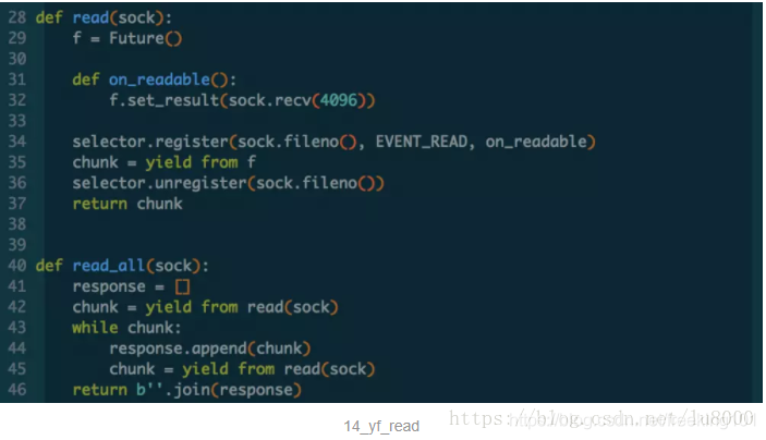 现在loop有了些许变化,callback()不再传递event_key和event_mask参数。也就是说,这里的回调根本不关心是谁触发了这个事件,结合fetch()可以知道,它只需完成对future设置结果值即可f.set_result()。而且future是谁它也不关心,因为协程能够保存自己的状态,知道自己的future是哪个。也不用关心到底要设置什么值,因为要设置什么值也是协程内安排的。
