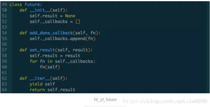 上面代码整体来讲没什么问题,可复用的代码已经抽象出去,作为子生成器也可以使用 yield from 语法来获取值。但另外有个点需要注意:在第24和第35行返回future对象的时候,我们了yield from f 而不是原来的yield f。yield可以直接作用于普通Python对象,而yield from却不行,所以我们对Future还要进一步改造,把它变成一个iterable对象就可以了。