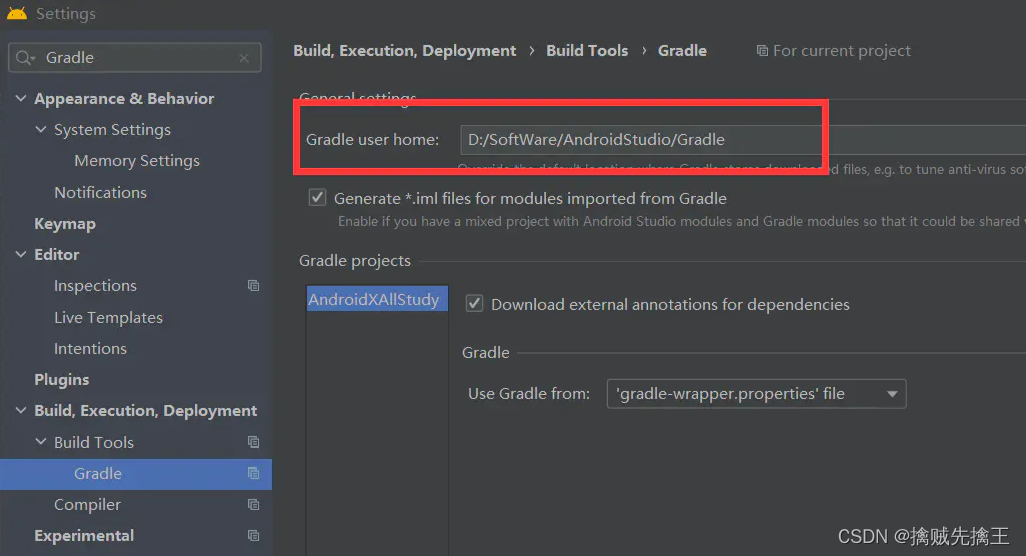 将如图路径改成你自定义的。这时候你会发现以后下载的Gradle都会进入这个文件里面。 但是当在 Android 里面执行 gradlew 命令的时候你会发现,他又去下载对应的 gradle 版本了,而且保存路径在默认的 c://[用户]//.gradle 里面。这时候问题来了,打开 gradle-wrapper.properties 文件仔细研究下文件里面写的东西: