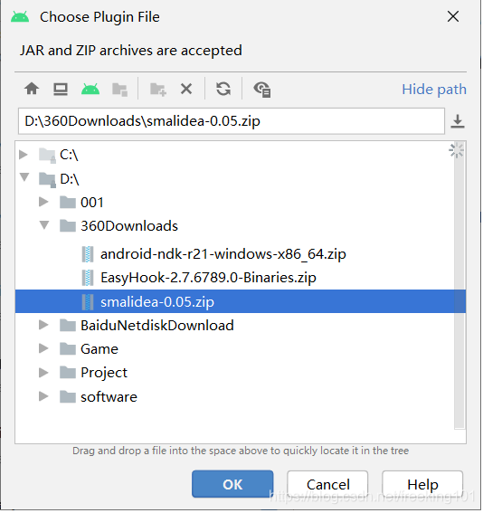 在弹出选择对话框中,找到下载好的 smalidea 压缩包,选择ok即可