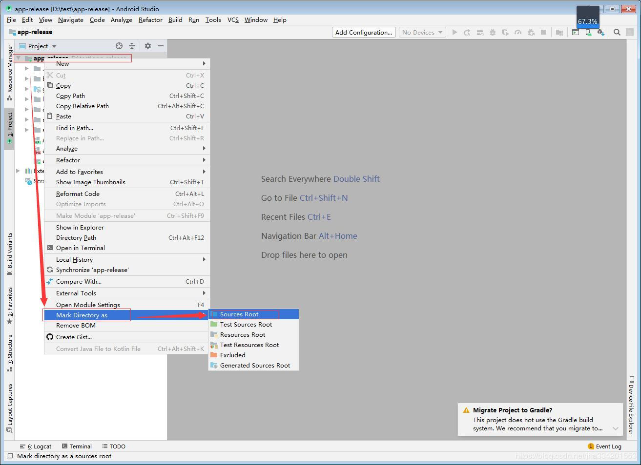 Import Project... -> Create project from existing sources- 将 Project(ALT+1)里面默认的 Android 视图切换为 Project 视图,将 src 设置为