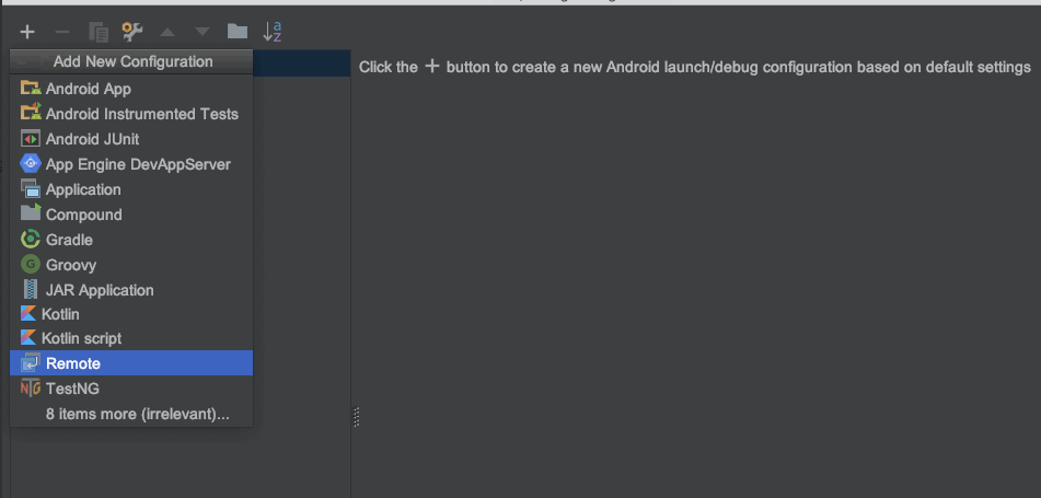 在出现的界面,点击左上角的“+”,在出现的下拉列表中再点击“Remote”,添加一个 remote 调试
