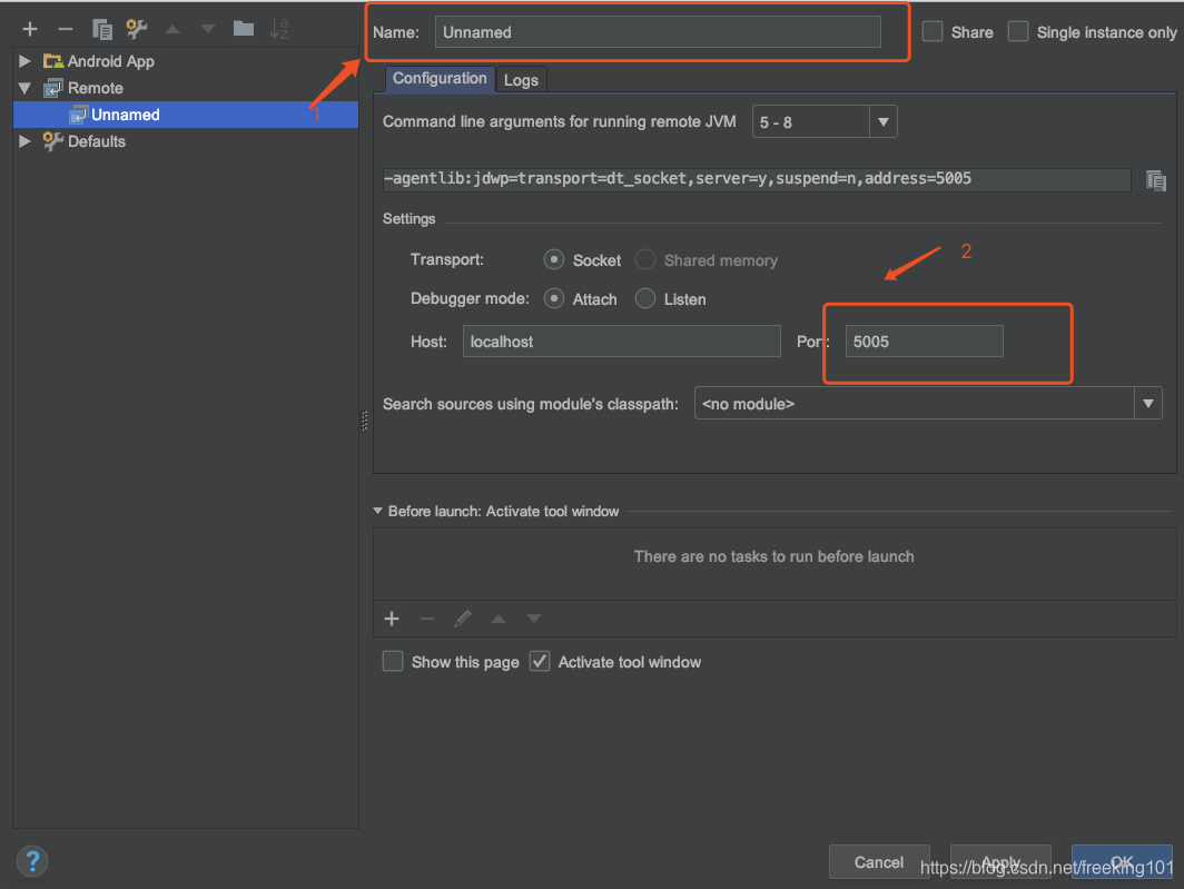 如上图,这里我直接使用默认的调试名称,则可运行的项目中多出了一个“Unnamed”选项,我们选中这个就行了,这时Android Studio就在“8700”端口监听项目的运行了。