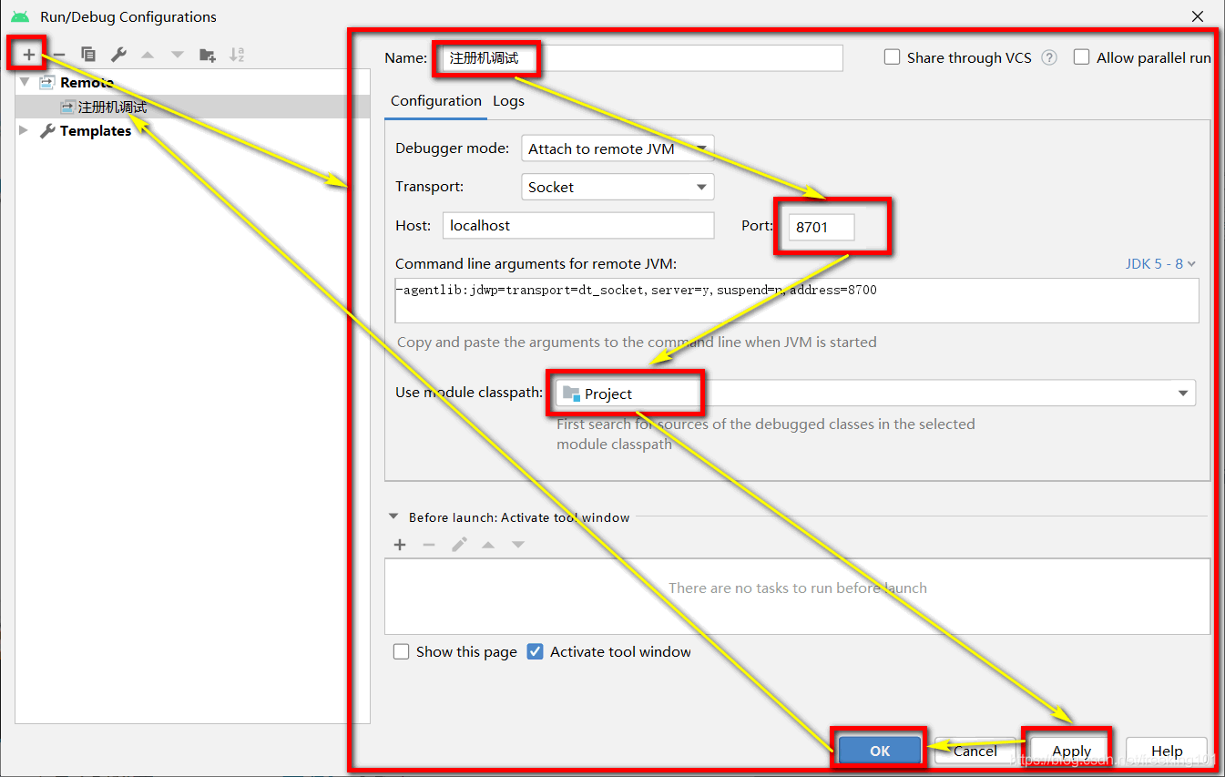 Run -> Edit Configuration进入Run/Dubug Configurations;Add New Configuration(+符号) -> Remote,将 5005 端口,修改为 8700 端口。