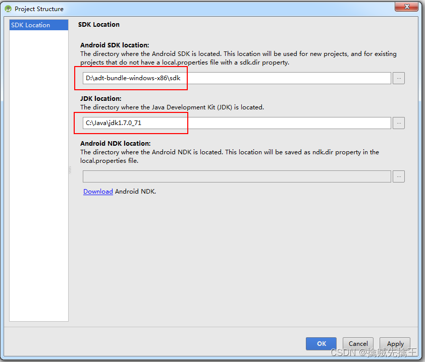 上图中,选择“Project Structure”,弹出如下界面:(选择JDK和Android SDK的路径)