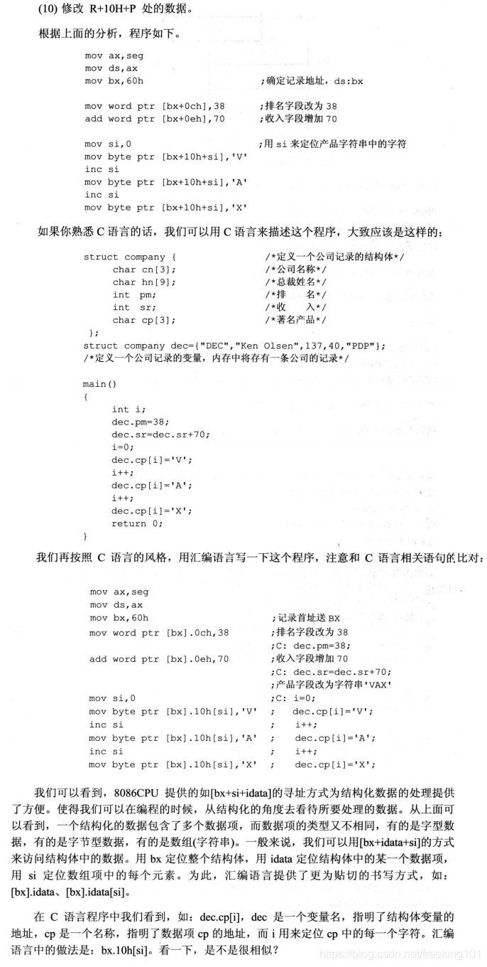 datasg endscodesg segmentstart:mov ax,datasgmov ds,axmov bx,60h ; 确定记录地址 ds:bxmov word ptr [bx+0ch],38 ; 排名字段改为 38add word ptr [bx+0eh],70 ; 收入字段增加 70mov si,0mov byte ptr [bx+10h+si], 'V' ;用 si 来定位产品字符串中的字符inc simov byte ptr [bx+10h+si], 'A' inc simov byte ptr [bx+10h+si], 'X'mov ax,4c00hint 21hcodesg ends