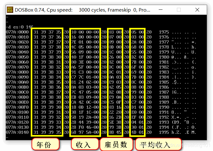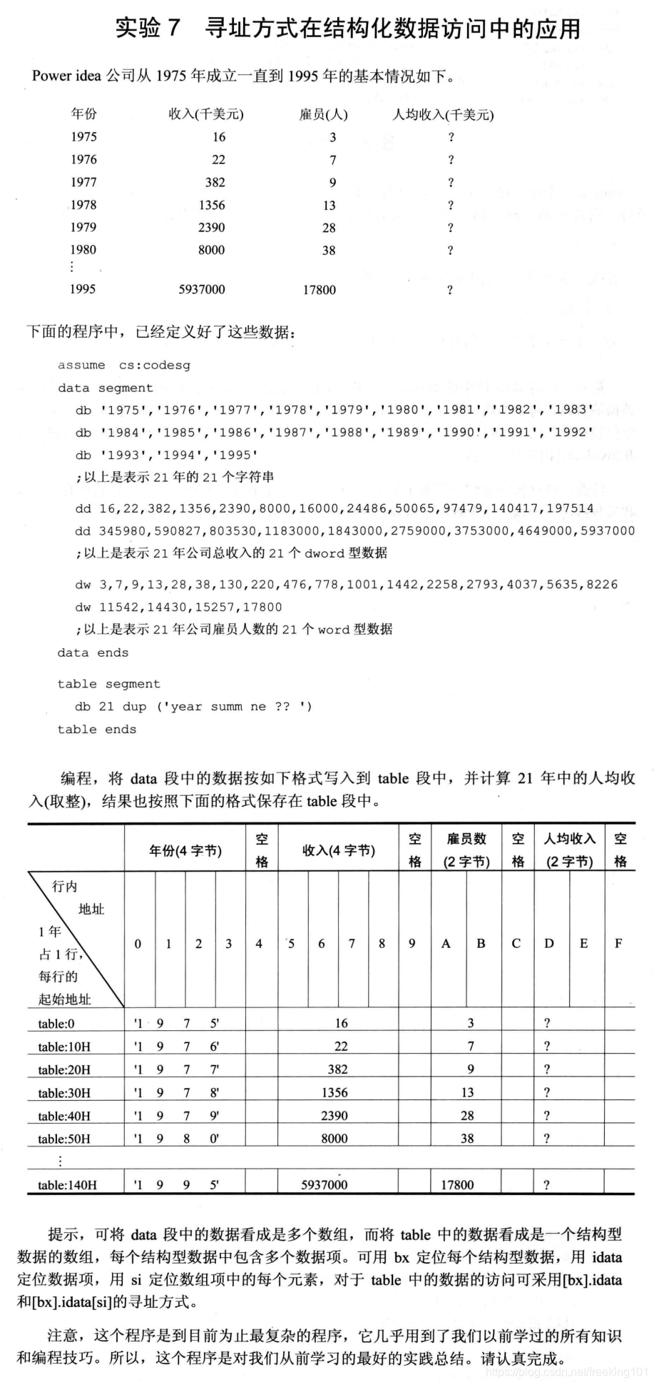 assume cs:codesgdata segmentdb '1975','1976','1977','1978','1979','1980','1981','1982','1983'db '1984','1985','1986','1987','1988','1989','1990','1991','1992'db '1993','1994','1995';84字节。总共 21 个年份,一个年份4个字节,总共 84 字节dd 16,22,382,1356,2390,8000,16000,24486,50065,97479,140417,197514dd 345980,590827,803530,1183000,1843000,2759000,3753000,4649000,5937000;84字节dw 3,7,9,13,28,38,130,220,476,778,1001,1442,2258,2793,4037,5635,8226dw 11542,14430,15257,17800;通过计算得到每一个代码段相对于起始的偏移量data endstable segmentdb 21 dup ('year summ ne ?? ')